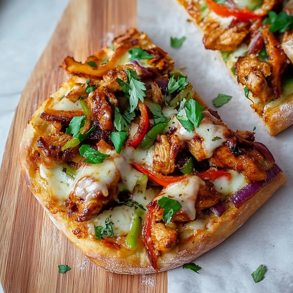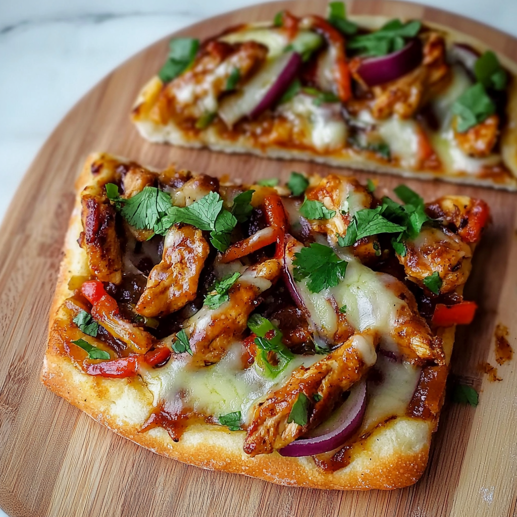 Preheat your oven to 375°F (190°C). Grab a large baking sheet and lay out your flatbreads (or naan). Generously brush each with BBQ sauce and sprinkle minced garlic over the top. Then layer on the mozzarella cheese followed by bite-sized pieces of cooked chicken, chopped onions, and peppers. Pop these beauties into the oven for about 10-15 minutes until they’re bubbly and golden brown.