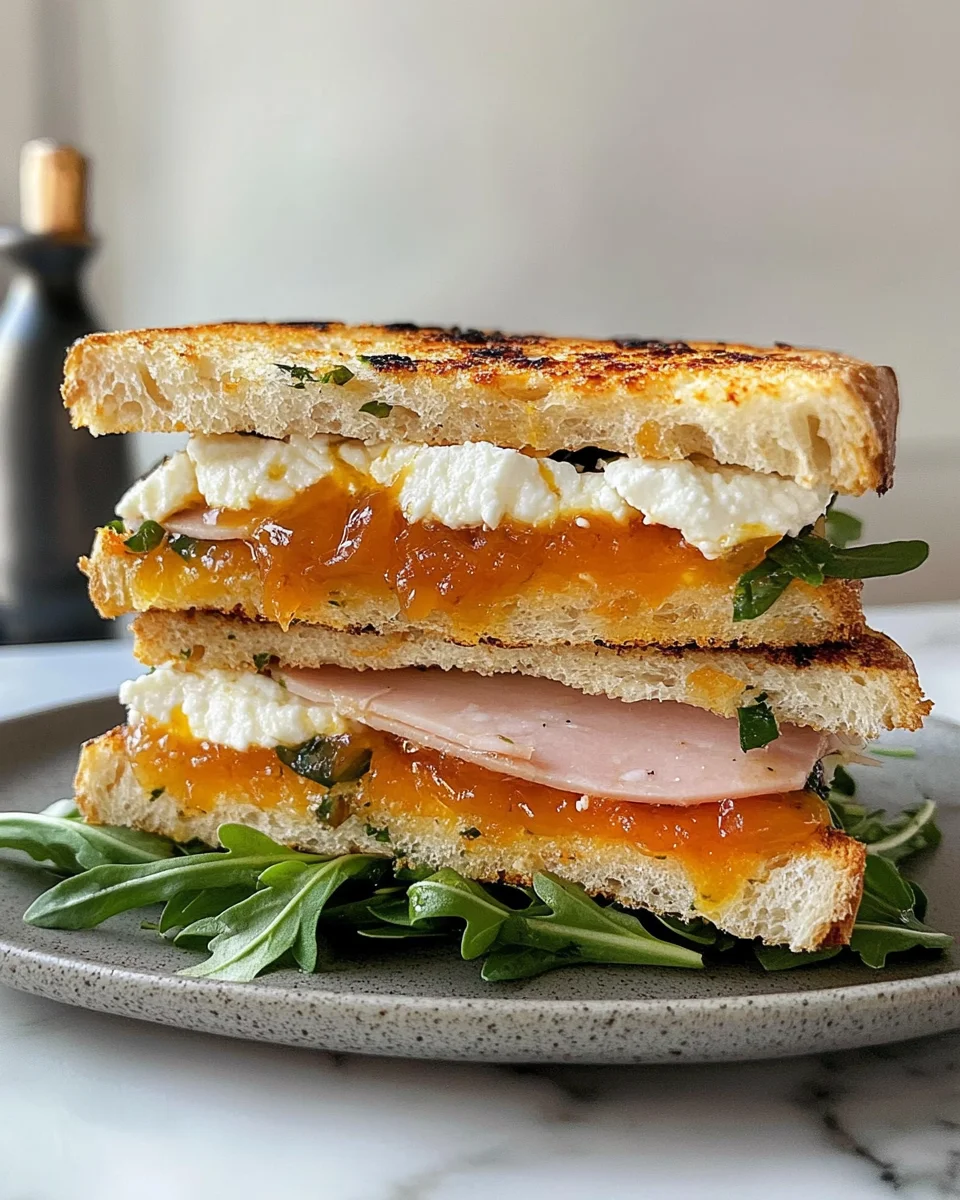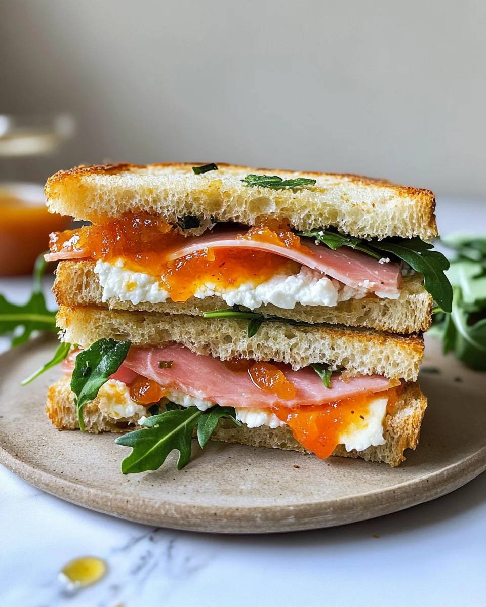 - Assemble the sandwich by spreading apricot jam on one slice of focaccia, layering with ham and goat cheese, adding rocket leaves, then drizzling lemon juice and olive oil before topping with the other slice.
